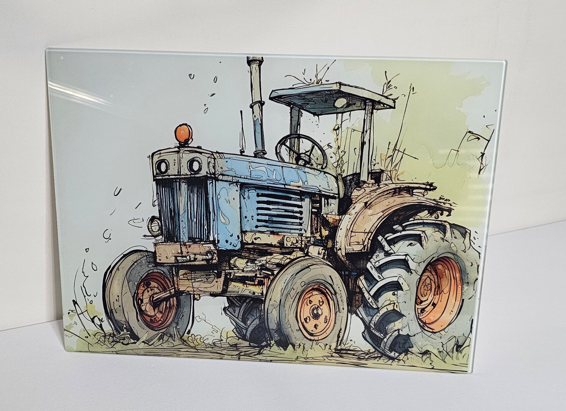 Looking for a unique and charming gift for your father? Introducing a hand-printed glass worktop saver that is sure to impress! This worktop saver features a large A3 size and showcases an eye-catching tractor image that's brimming with country charm.